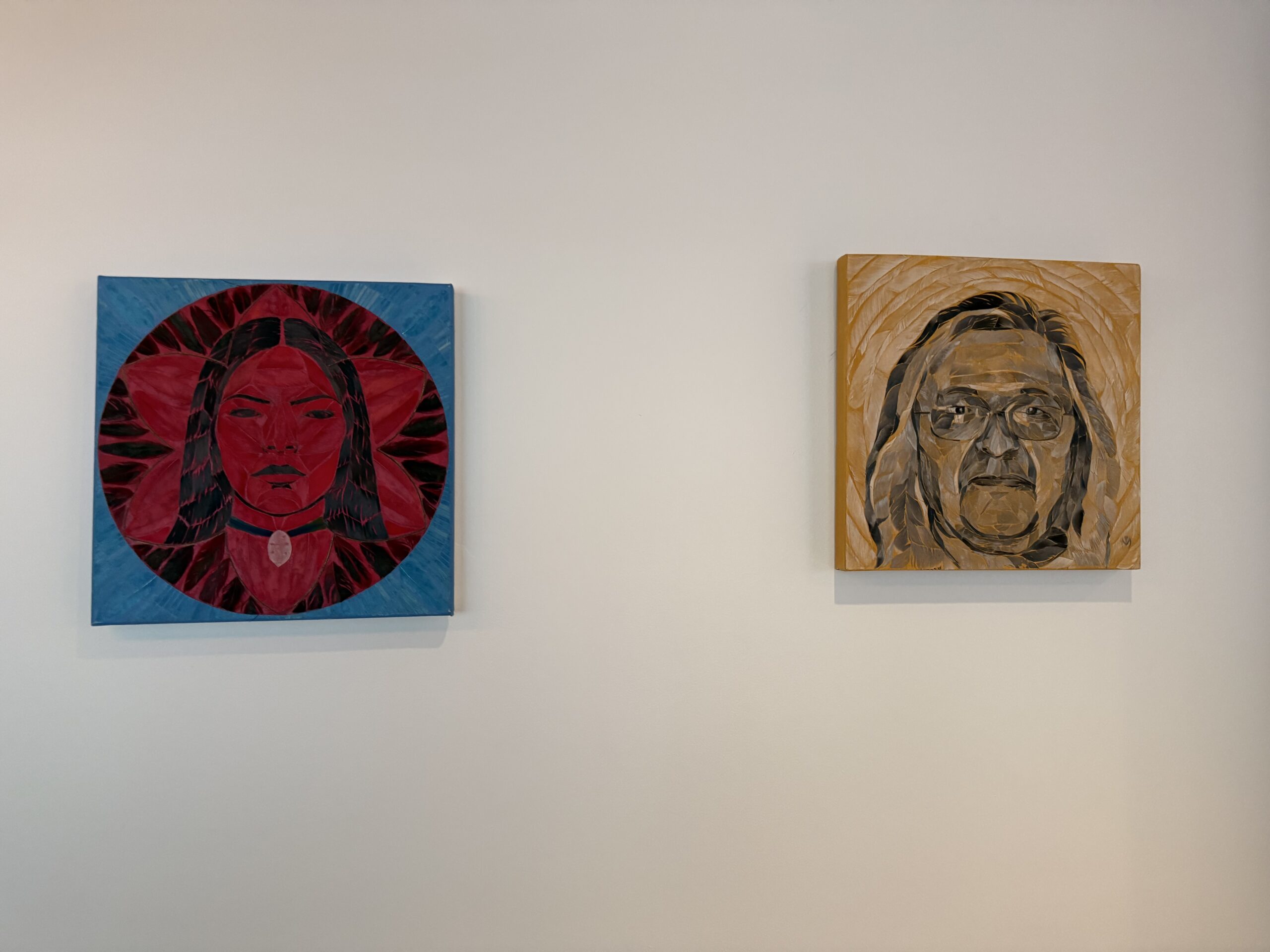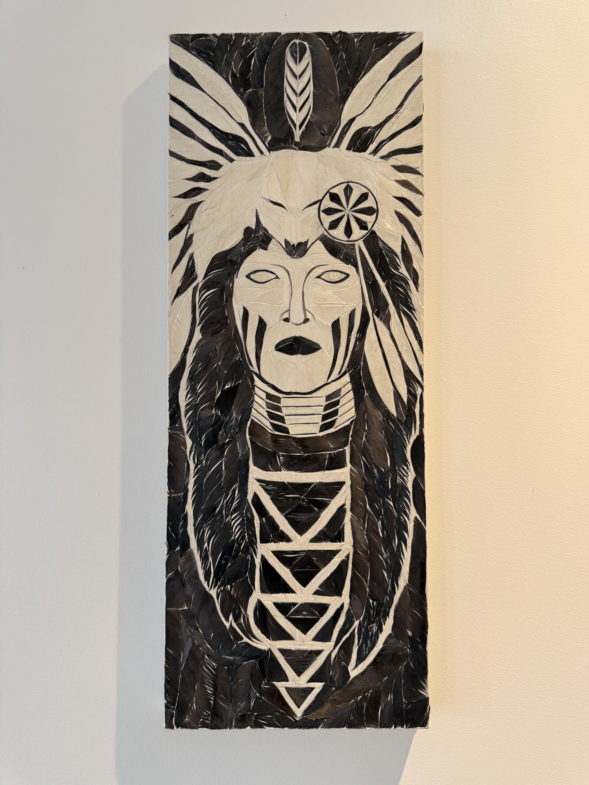 Vin’s artwork merges his artistic skills with a passion for Native American culture. He developed a technique called linear featherwork, using naturally sourced feathers from local parks, including wood pigeons, crows, and geese. This method applies cut sections of feathers to tinted canvas, highlighting the spiritual significance of feathers in Native American culture and blending it with contemporary abstract art.